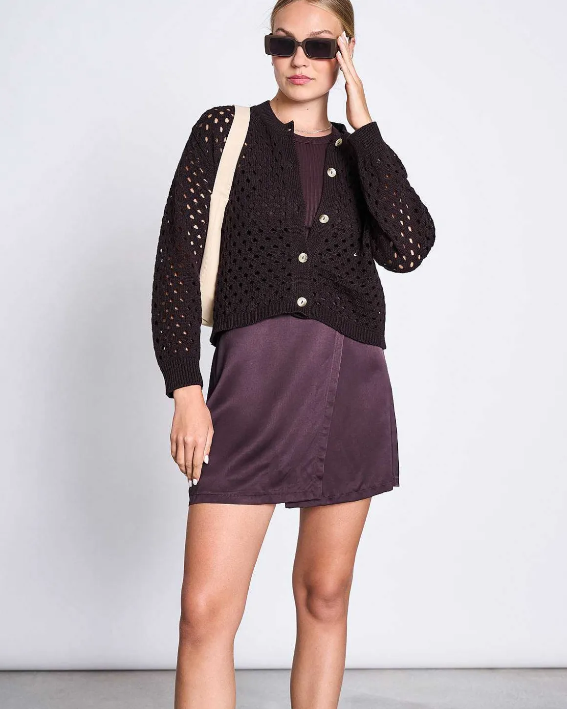 Dies Ist Ellon, Unsere Perforierte Strickjacke. Sie Hat Knöpfe Auf Der Vorderseite Und Eine Lockere Passform. Ellon Ist Ein Schönes Modisches Accessoire, Das Du Sowohl Über Ein Crop-Top Als Auch Über Einen Dünnen Rollkragenpullover Oder Als Ergänzung Zu Deinem Strandlook Im Nächsten Urlaub Tragen Kannst.