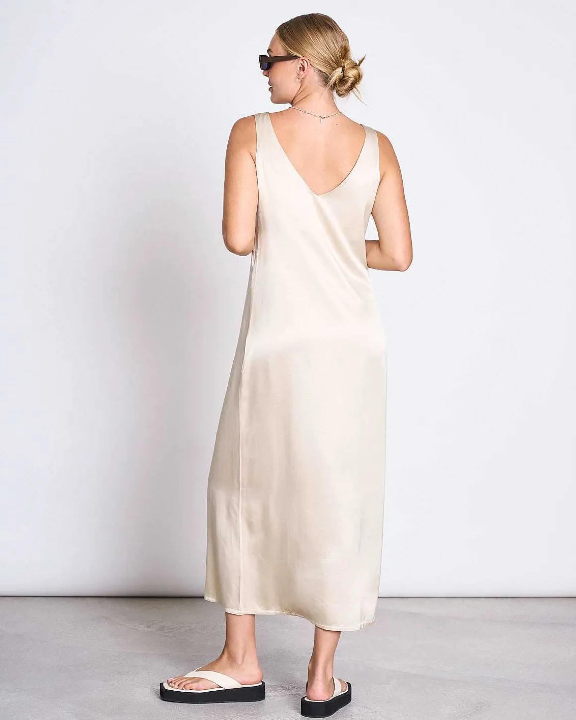 …Ohne Jede Anstrengung. Darf Ich Vorstellen: Benvie, Das Fließende, Locker Geschnittene Midikleid Mit V-Ausschnitt Vorne Und Hinten Und Breiteren Trägern. Benvie Ist Dein Treuer Begleiter Für Sommerhochzeiten, Tanzabende Am Strand Oder Was Auch Immer Du Diesen Sommer Vorhast. Du Kannst Es Auch An Kälteren Tagen Mit Einem Rollkragenpullover Darunter Tragen.