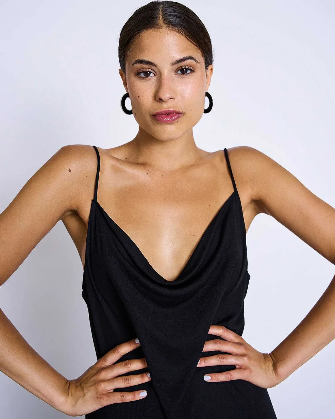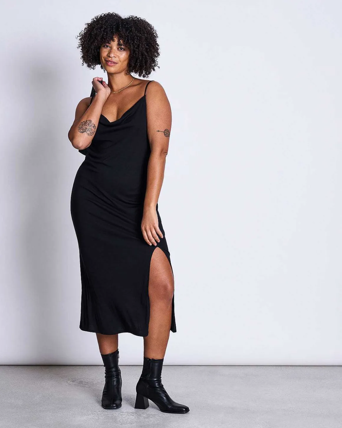 Das Midi Kleid Helen Hat Einen Wasserfallausschnitt, Der Allen Boob Shapes Schmeichelt! Helen Hat Eine Midi-Länge Und Einen Langen Schlitz Auf Der Vorderseite.